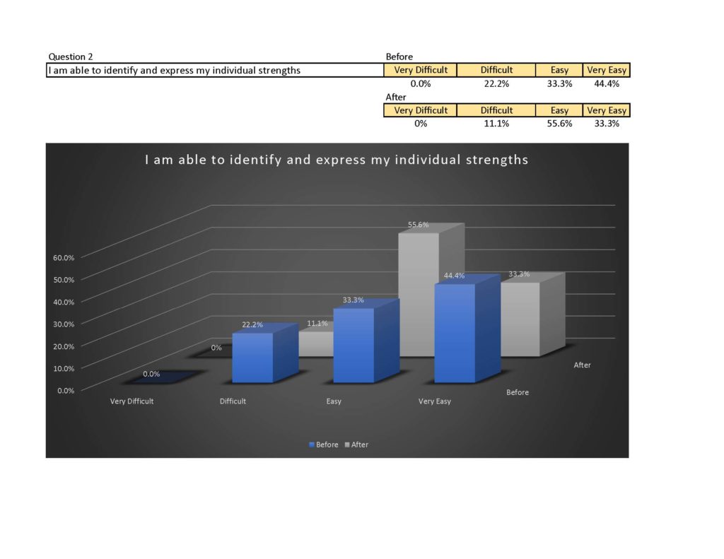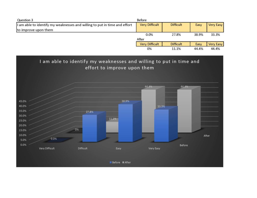 For the third question, “I am able to identify my weaknesses and willing to put in time and effort to improve upon them,” 27.8% of students said before the classes that they found this Difficult; 38.9% said they found it Easy; and 33.3% said they found it Very Easy. After the classes, only 11.1% said they found it Difficult; 44.4% said they found it Easy, and 44.4% said they found it Very Easy. In this way, Applied Improvisation encourages honesty with oneself and learning how to improve. Anyone who has struggled in an interview with the question “What are your greatest weaknesses?” can appreciate how important honesty is.