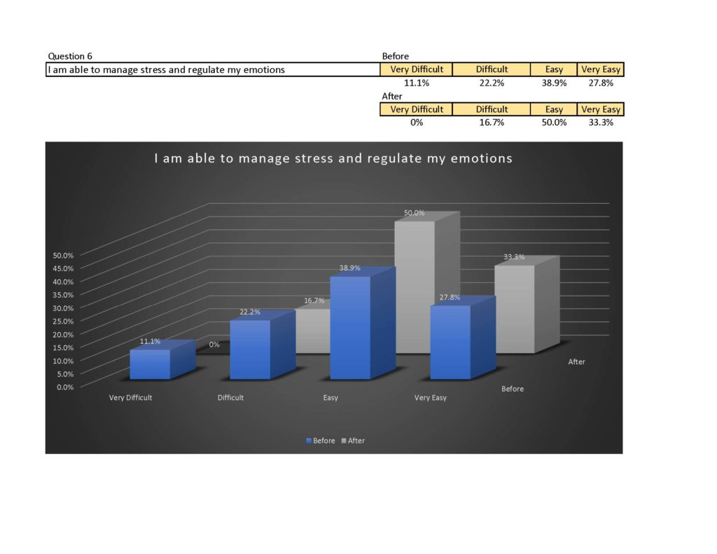 For the sixth question, “I am able to manage stress and regulate my emotions,” 11.1% of students said before the classes that they found it Very Difficult; 22.2% said they found it Difficult; 38.9% said they found it Easy; and 27.8% said they found it Very Easy. After the classes, 0% (again, no one!) said they found it Very Difficult; 16.7 % said they found it Difficult; 50% said they found it Easy, and 33.3% said they found it Very Easy. As mentioned above, for most people, interviewing is a stressful experience, but the practices of AI can help manage your fears, letting you roll with the punches and focus on doing your best.