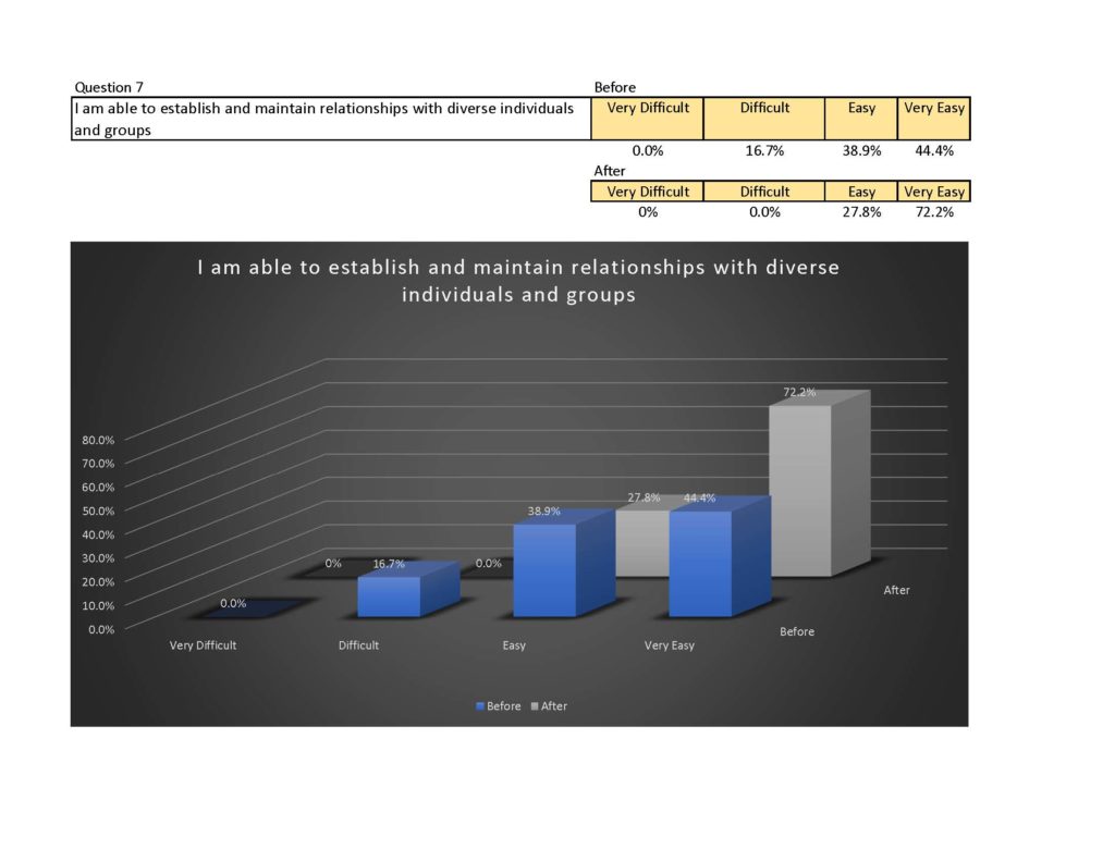 For the seventh question, “I am able to establish and maintain relationships with diverse individuals and groups,” 16.7% of student said before the classes that they found this Difficult; 38.9% said they found it Easy, and 44.4% said they found it Very Easy. After the classes, 0% (no one!) said they found it Difficult; 27.8% said they found it Easy, and a whopping 72.2% said they found it Very Easy. When interviewing, you are seeking to form what you hope will be a long and fruitful relationship with people who might well be strangers, a challenge for even the most outgoing people. With AI, this no longer has to be a roadblock, but an opportunity for new and amazing experiences.