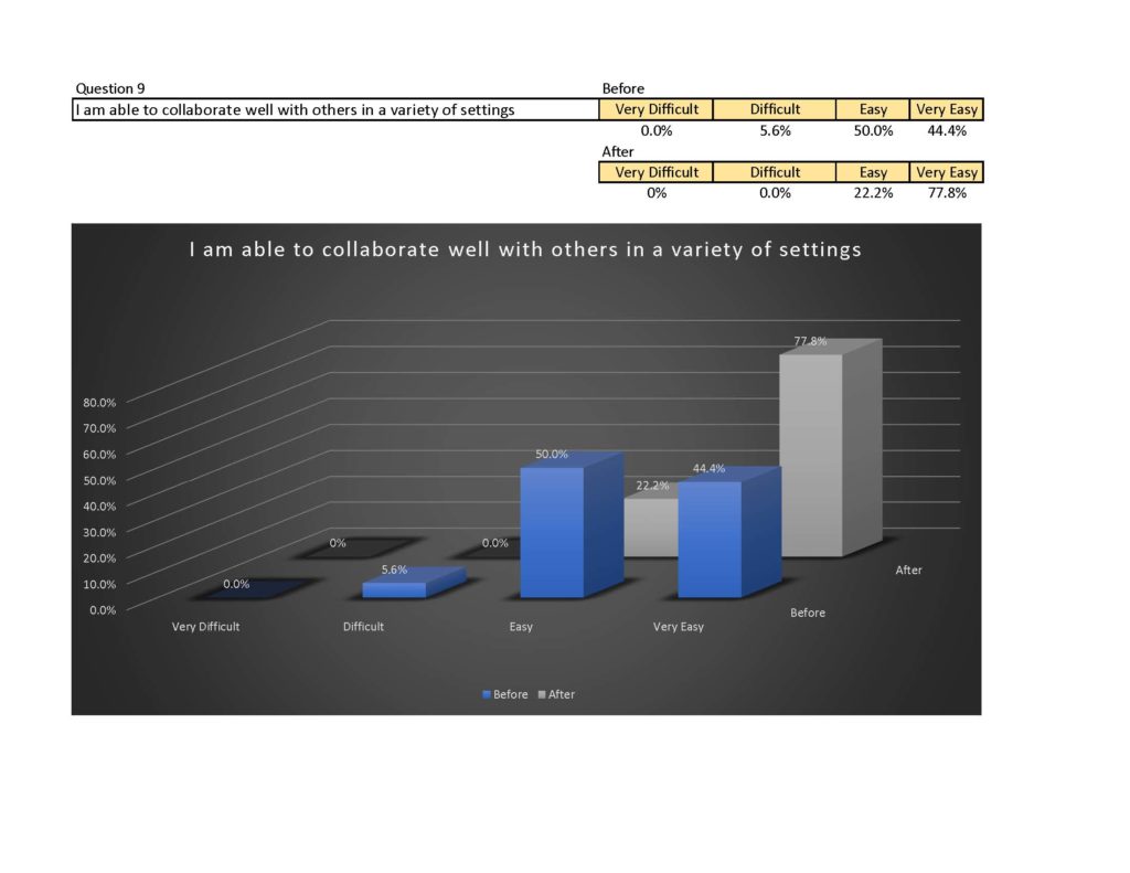 For the ninth question, “I am able to collaborate well with others in a variety of settings,” 5.6% of students said before the classes that they found this Difficult; 50% said they found it Easy; and 44.4% said they found it Very Easy. After the classes, 0% (no one!) said they found it Difficult; 22.2% said they found it Easy; and 77.8% (wow!) said they found it Very Easy. At the heart of AI, as in the workplace, is working together: not only do you perform well, but you make your partners look and feel good as well. Demonstrating skill at collaboration in an interview can be a valuable asset.